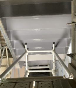 完成し利用する皆様の笑顔を思い浮かべながら真っ黒な鉄骨階段を塗装していきます!