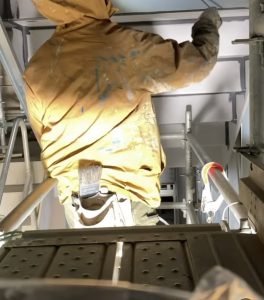 完成し利用する皆様の笑顔を思い浮かべながら真っ黒な鉄骨階段を塗装していきます!